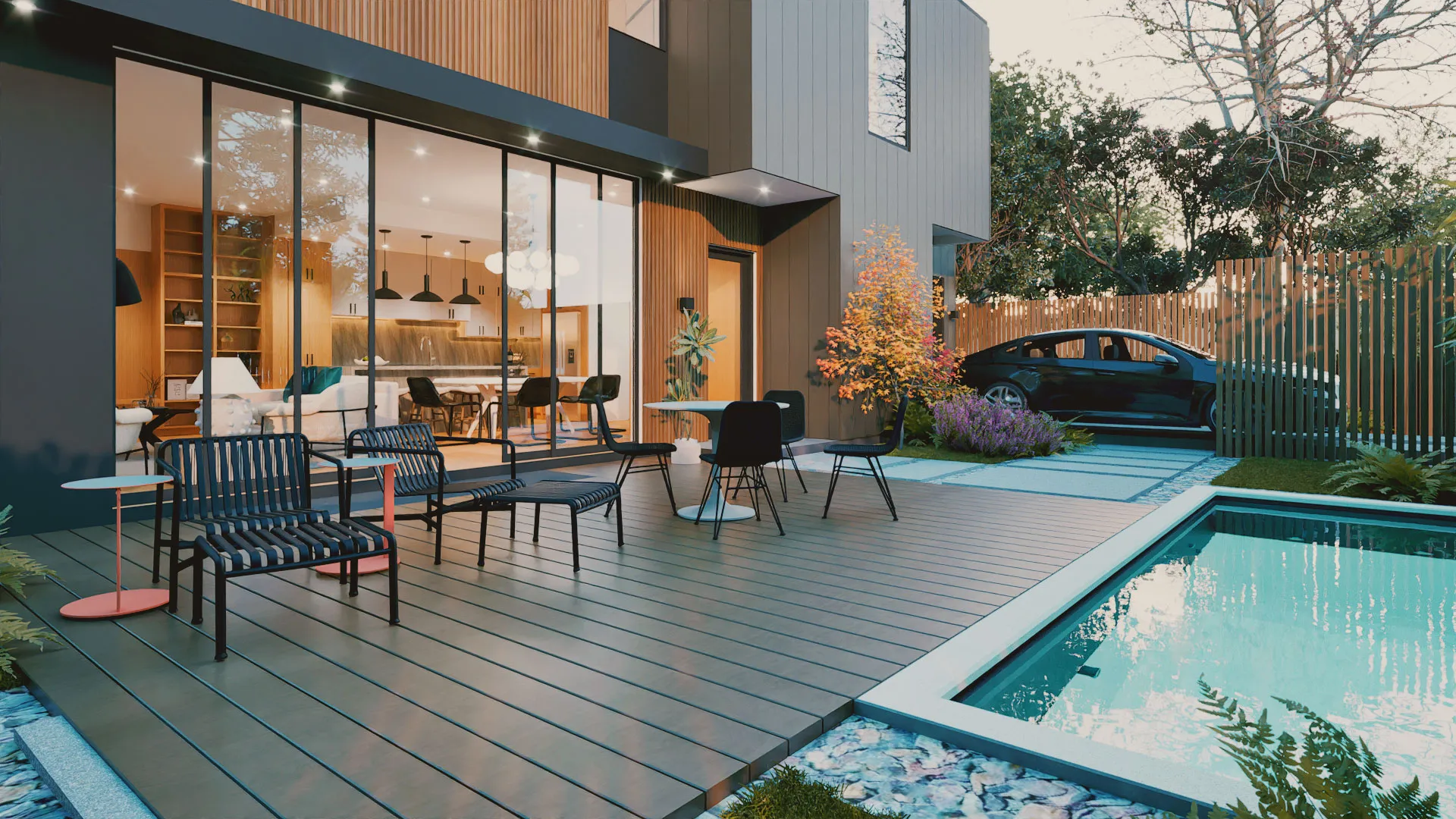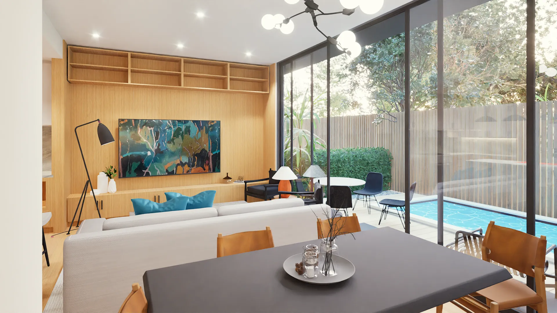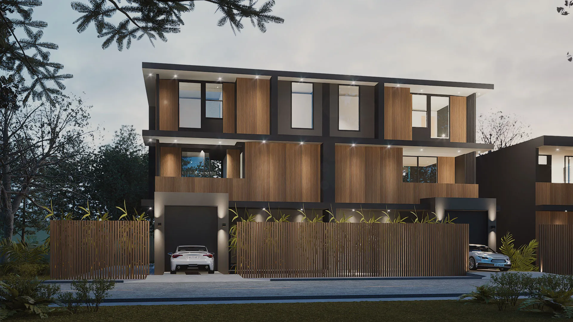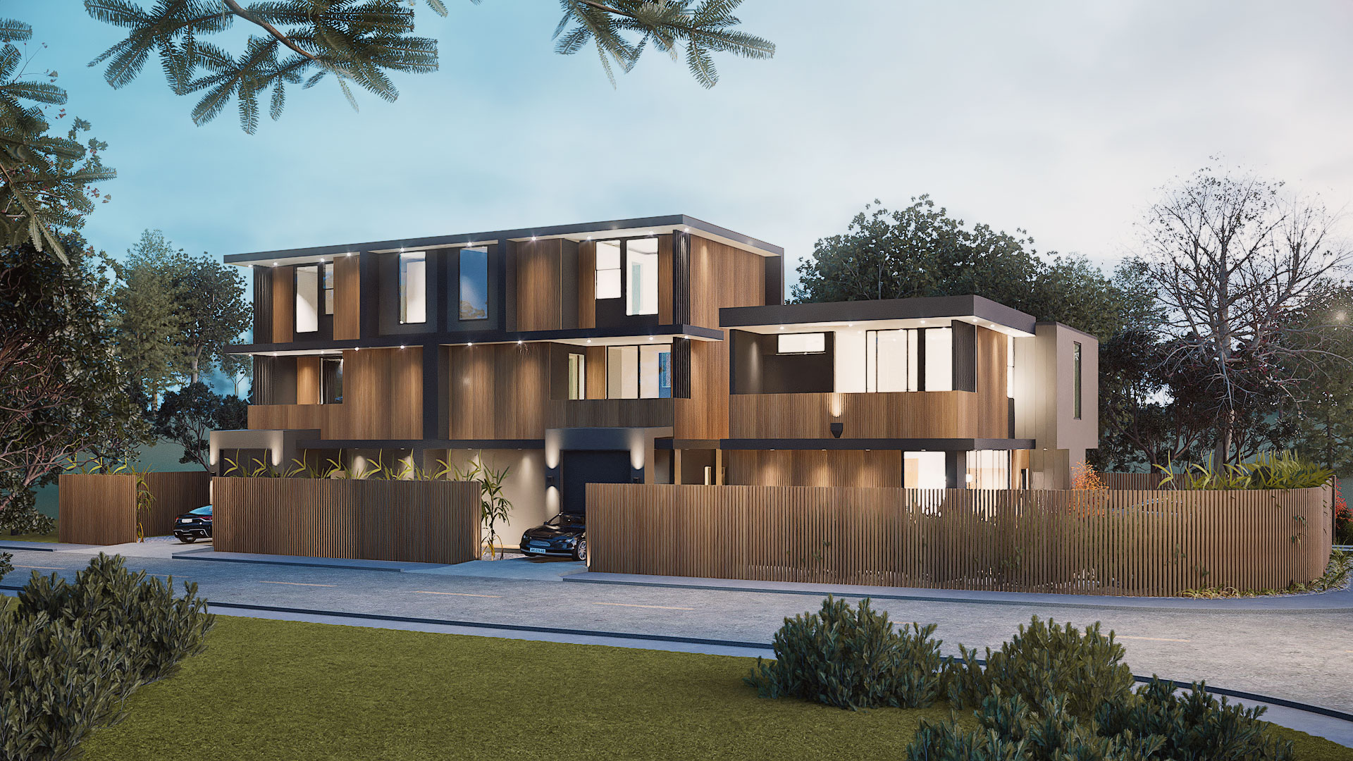 With clean, contemporary facades, the residences present a cohesive architectural identity while allowing each home to feel distinct. Inside, wire-brushed white oak floors and warm grey plaster walls and ceilings create a calm, elevated atmosphere, with natural light filling the open living areas and extending to private backyard retreats with pools.