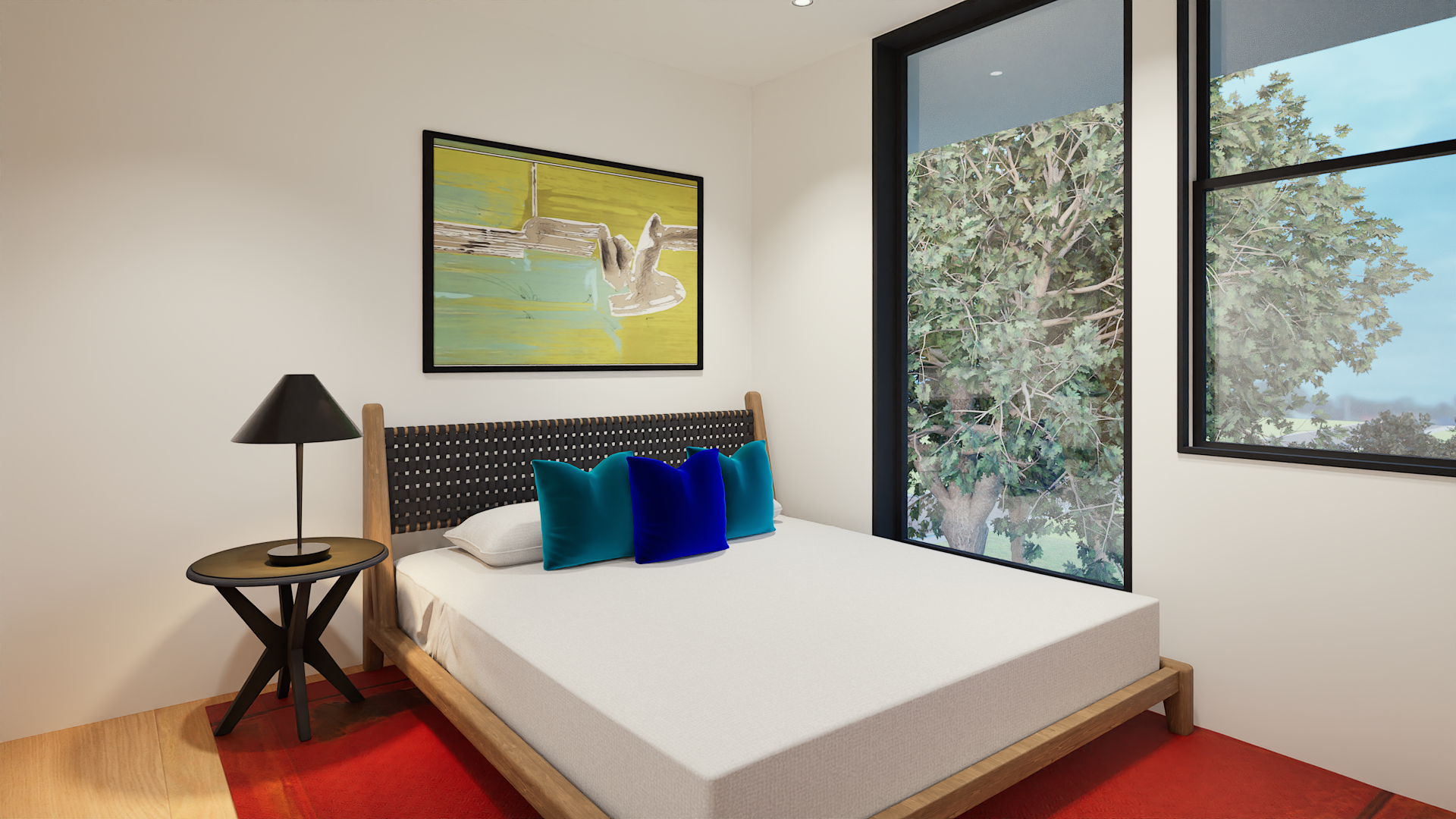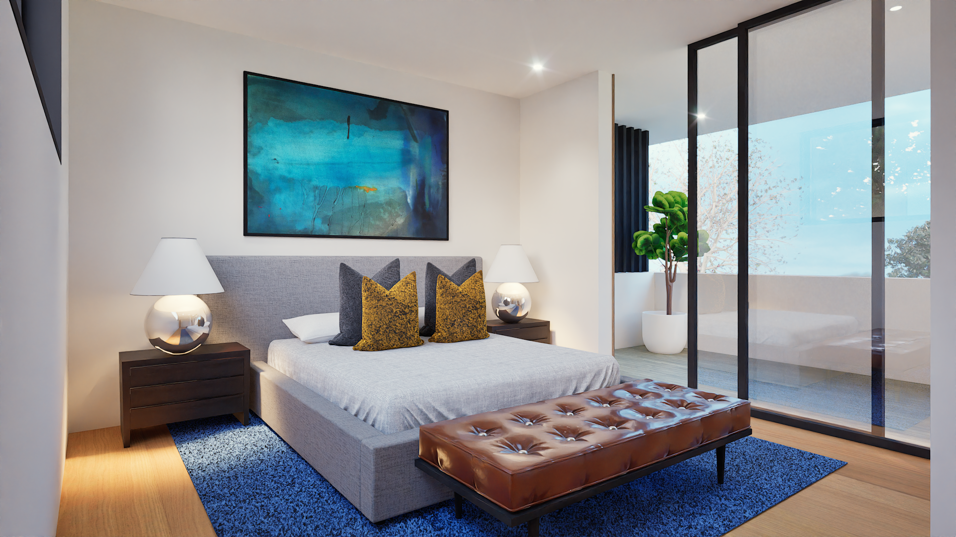 The main bedroom offers a quiet escape with a well-appointed bath and generous walk-in closet. At the center of each home, the kitchen combines form and function with premium appliances, natural stone countertops with waterfall islands, and custom walnut cabinetry crafted for performance and longevity.
