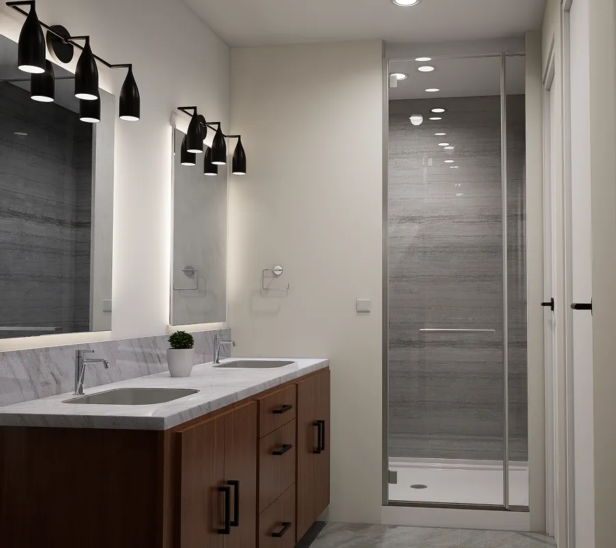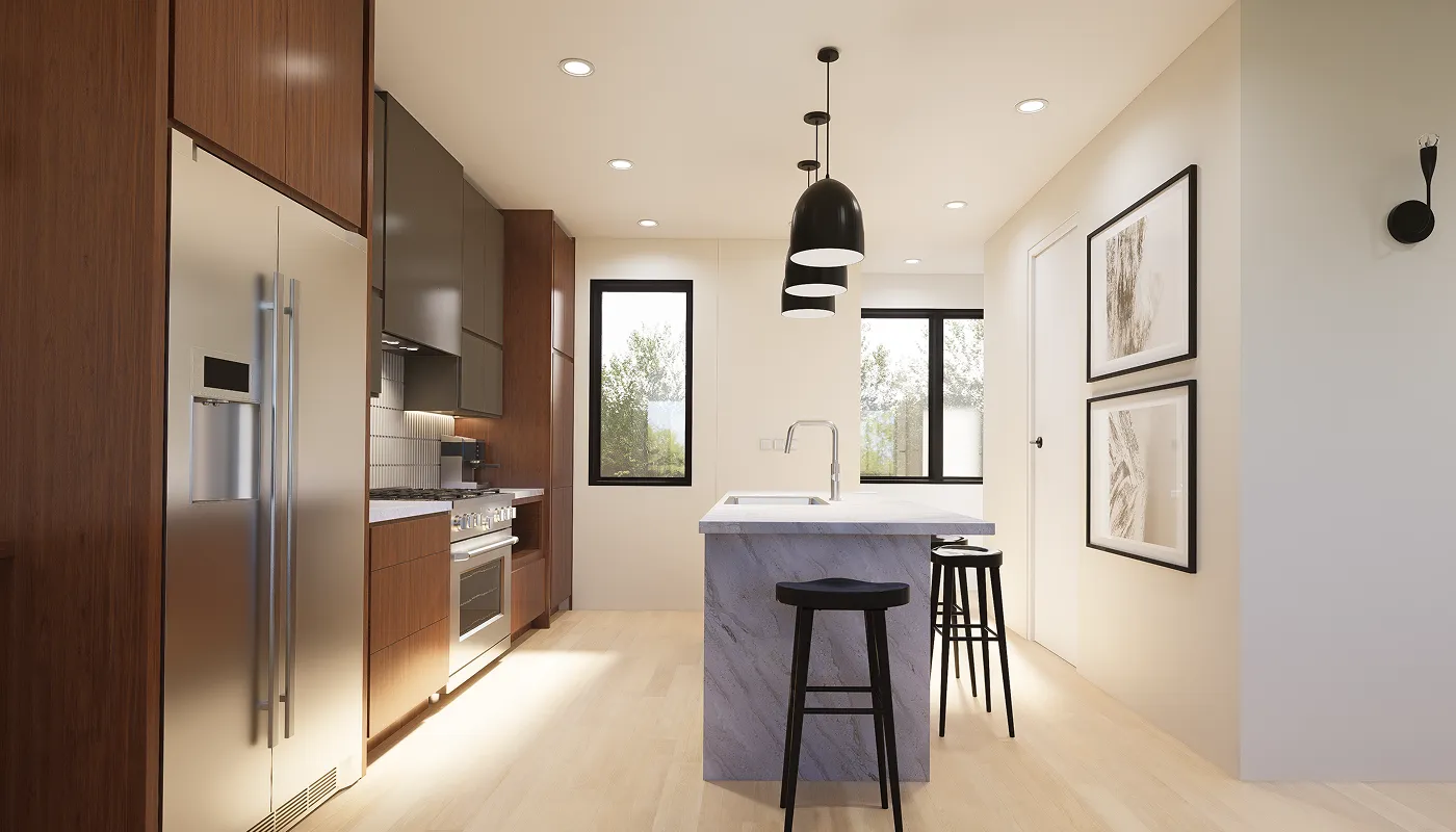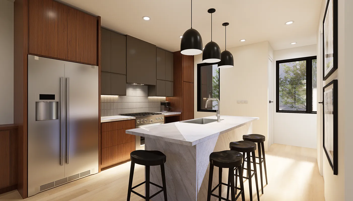 Inside, open living spaces are anchored by high-quality finishes and durable materials selected for everyday performance. Kitchens are outfitted with natural stone countertops, custom cabinetry, and streamlined appliances, creating a functional yet refined centerpiece for daily living and entertaining.
