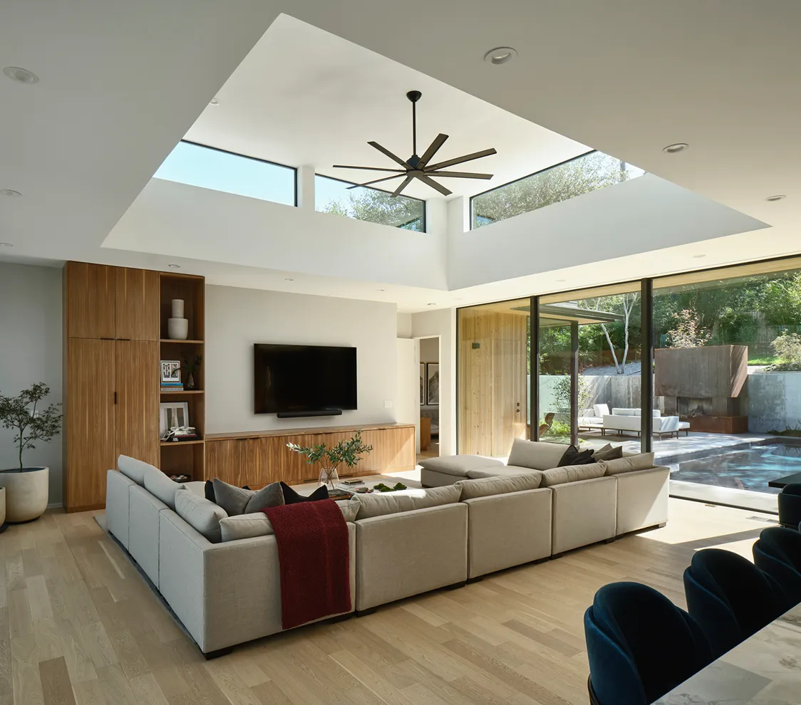At the heart of the home, the kitchen is both functional and refined. A custom island, stone countertops, and Wolf & Sub-Zero appliances make it ideal for everyday living or hosting. Large sliding doors open the living room and studio to a private backyard with a pool, creating a seamless flow.