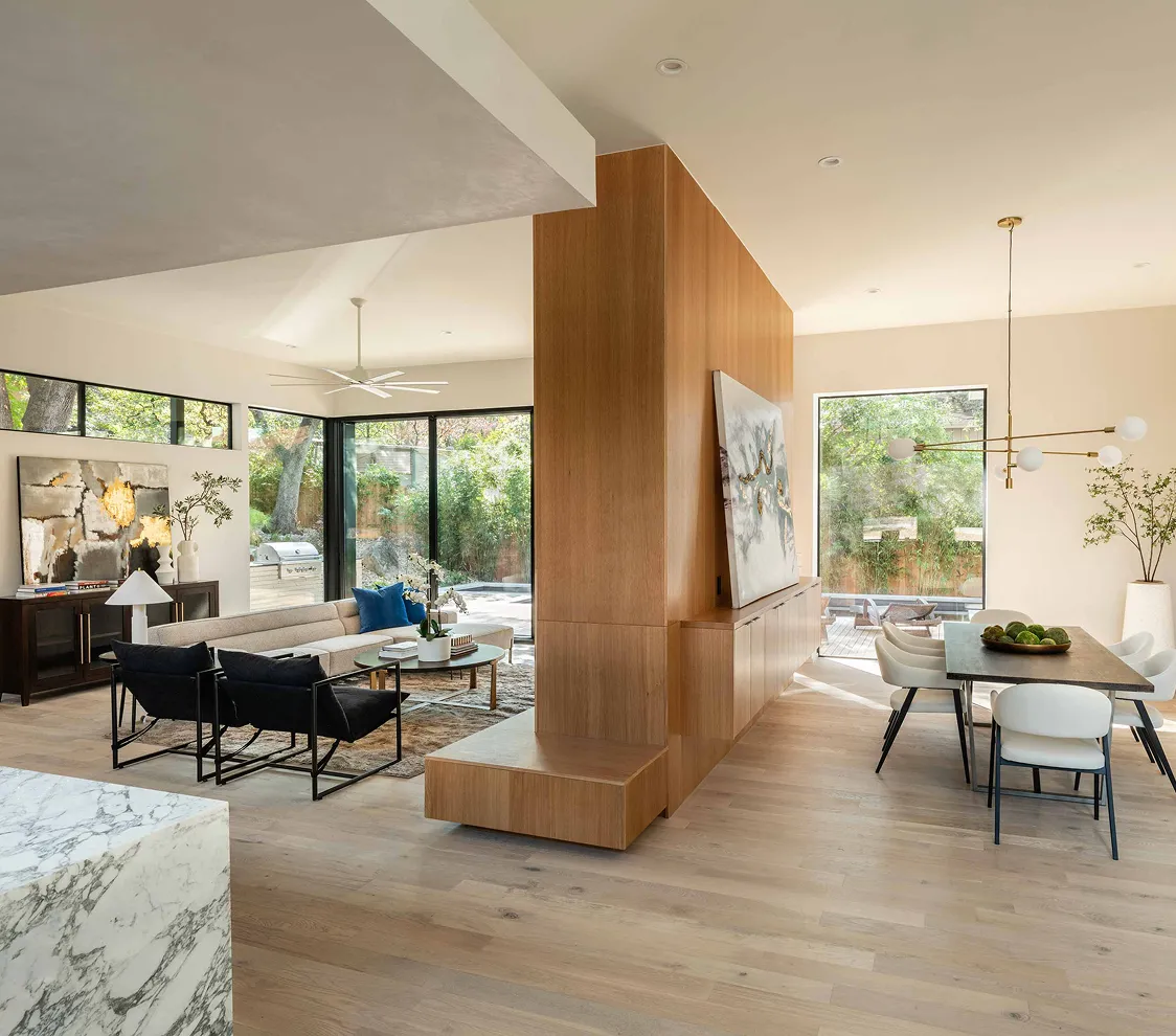 Wrapped in natural stone and warm wood accents, this home embodies timeless elegance with a modern edge. Floor-to-ceiling windows fill the different areas with light and open directly to the outdoor setting. The private backyard offers a peaceful retreat with a pool and shaded patio.