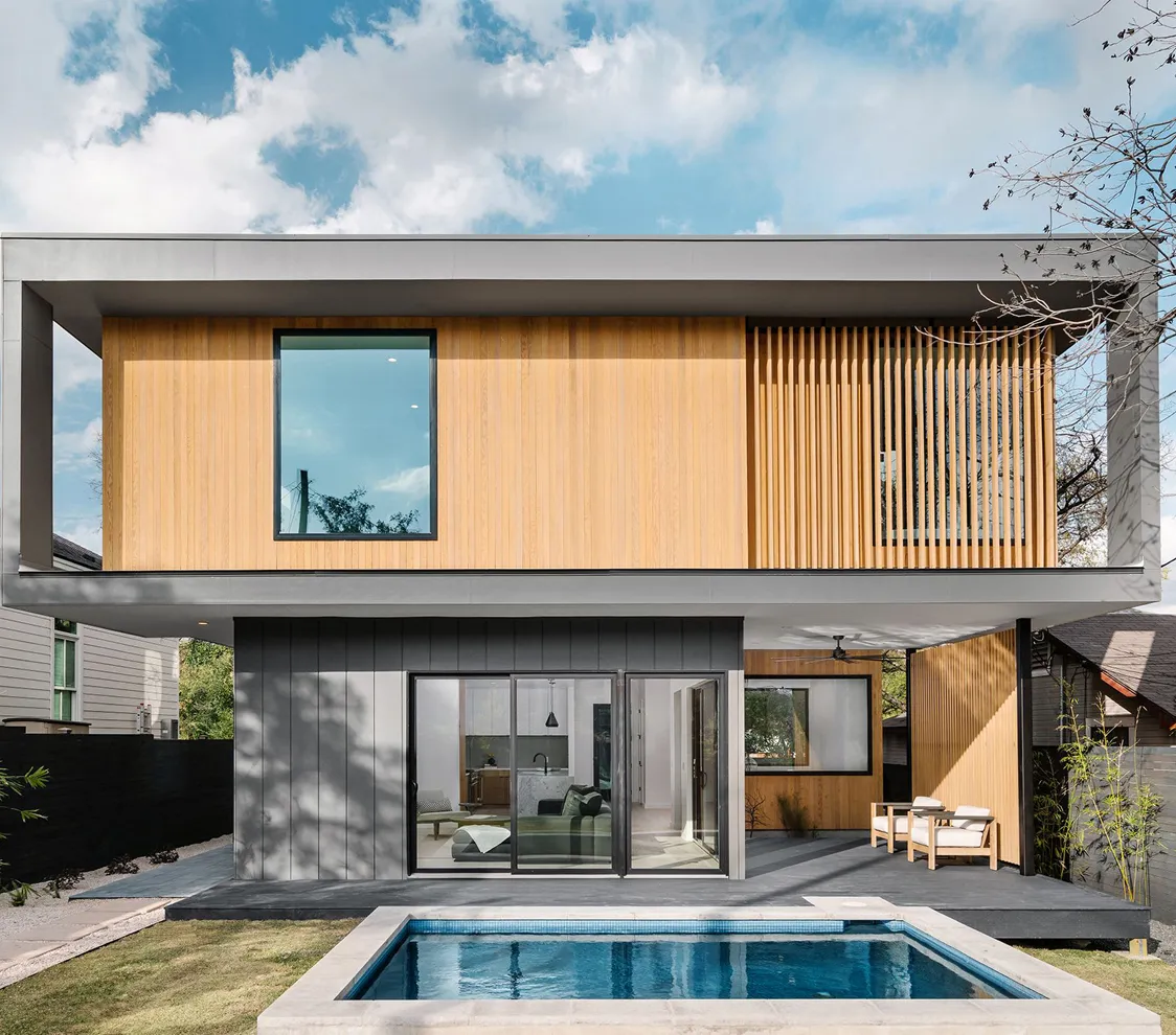 Clad in a sophisticated mix of natural wood, dark gray siding, and glass, this home offers a refined architectural presence that feels both grounded and elevated. Inside, an open-concept layout is filled with natural light from floor-to-ceiling windows, which frame outdoor views and open seamlessly to a private retreat featuring a pool and shaded lounge.