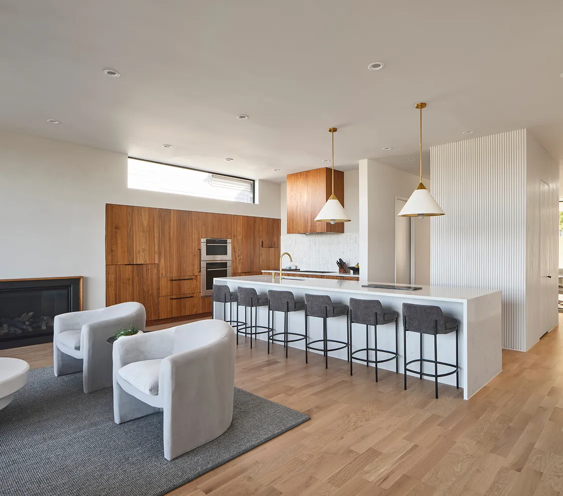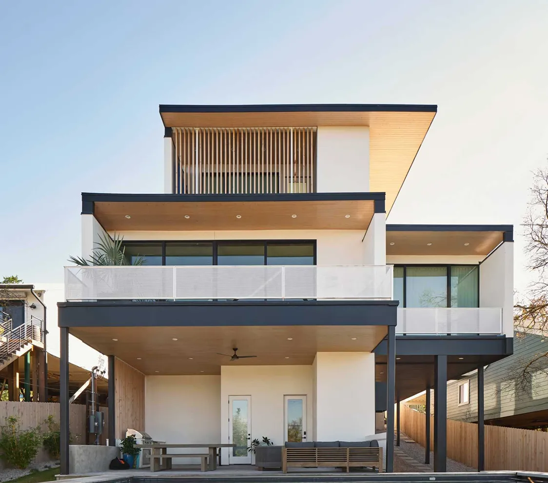Wrapped in warm wood paneling and sculpted stucco, this home captures the essence of elevated Austin living with a design that feels both bold and grounded. The main living area flows effortlessly to a private outdoor retreat—featuring a pool, shaded lounge, and dining terrace.